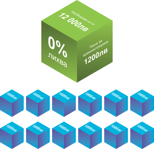 При отпуснат кредит в размер на 12 000 лв. за период от 12 седмици (при 12 равни седмични вноски), еднократната такса за администриране на кредита ще е 1 200лв. и седмичната ти вноска ще е 1 000 лв.